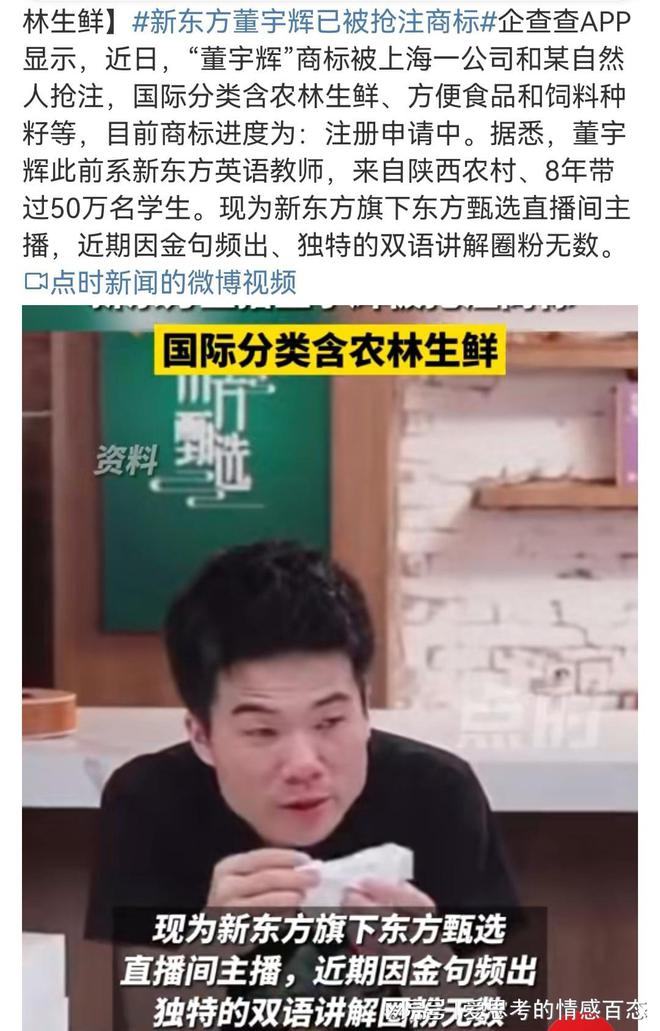新東方主播董雨欣被搶出商標(biāo),這也是令人想象不到的事情,主要是因?yàn)檫@種帶貨方式讓董宇輝火了一把。在國際商標(biāo)分類中含有農(nóng)林生鮮以及方便食品和飼料種子這些商標(biāo)目前的進(jìn)度都是注冊申請中。了解過董雨輝的人都知道,此人是新東方的英語教師,來自于陜西農(nóng)村8年已經(jīng)帶過50萬名學(xué)生現(xiàn)在成為新東方旗下的一名直播間,主播因?yàn)榻鹬割l出以及獨(dú)特的雙語帶貨,在講解的過程中圈粉無數(shù)。
