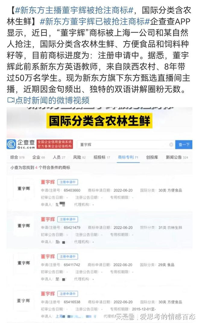在6月29號的時(shí)候,通過國家知識產(chǎn)權(quán)官網(wǎng)的顯示,會發(fā)現(xiàn)最近比較火的新東方主播董永輝商標(biāo)被眾多企業(yè)搶注商標(biāo),其中包括上海潤騰實(shí)業(yè){},還有自然人楚客坤申請注冊。在國際分類中主要包含的一些國際商標(biāo)有茶,巧克力,糕點(diǎn),甜食,通過相關(guān)的查詢方式,這些商標(biāo)以及詳情顯示,而且有人正在申請商標(biāo)等待處理,并且無法查詢到詳細(xì)的信息。董宇輝是新東方旗下最新的甄選主播,因?yàn)橛米约旱闹R去帶貨爆紅,所以影響力比較大,并且在東方甄選的直播間粉絲能夠達(dá)到2,000萬,所以帶貨是比較多的。