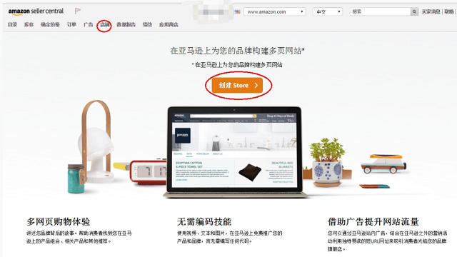 第1步:登陸亞馬遜后臺,點(diǎn)擊“店鋪”,選擇“創(chuàng)建Store”;
