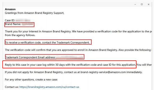 第8步:提交之后,亞馬遜會發(fā)一封品牌備案的郵件,需要在30天內(nèi)回復(fù)驗(yàn)證碼(如果你的商標(biāo)是找服務(wù)商注冊的,就直接找注冊的服務(wù)商索?。?;