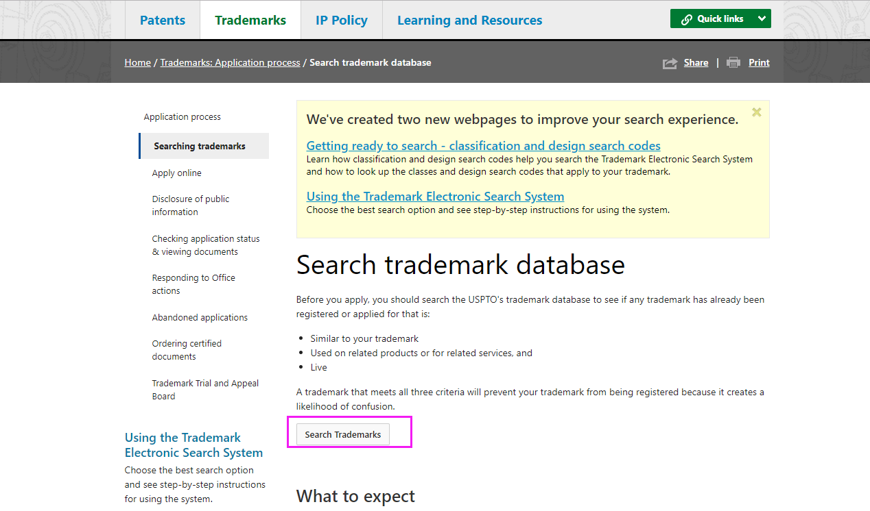 2.不用詳細(xì)閱讀,點(diǎn)擊“searching trademarks",選擇第一種查詢方式;