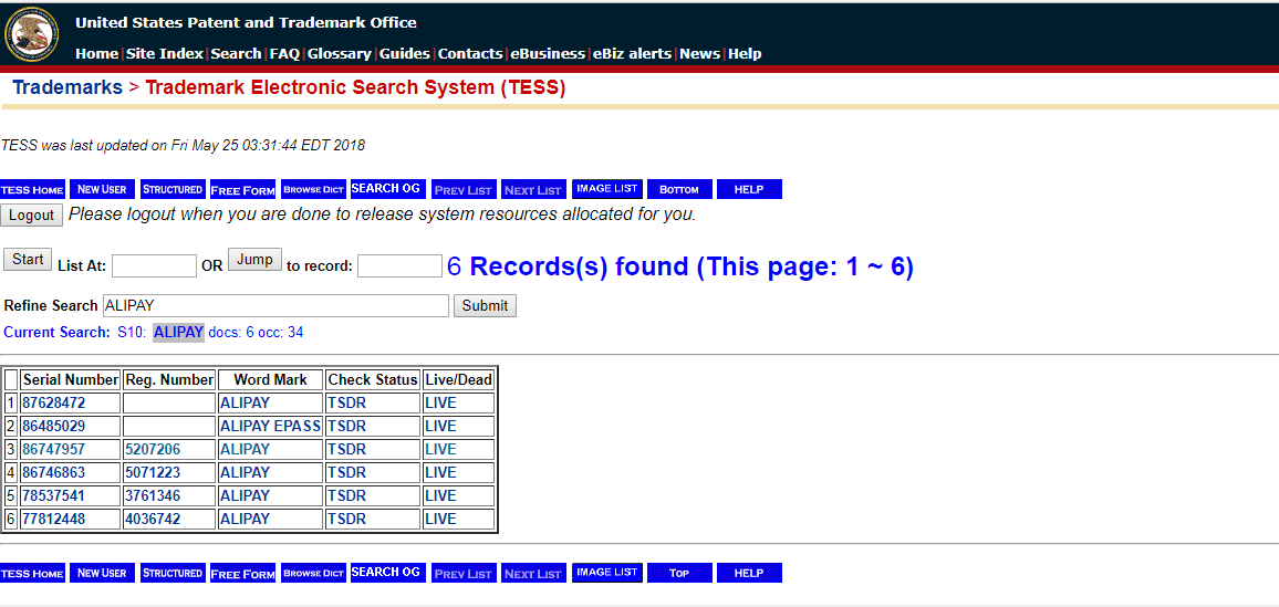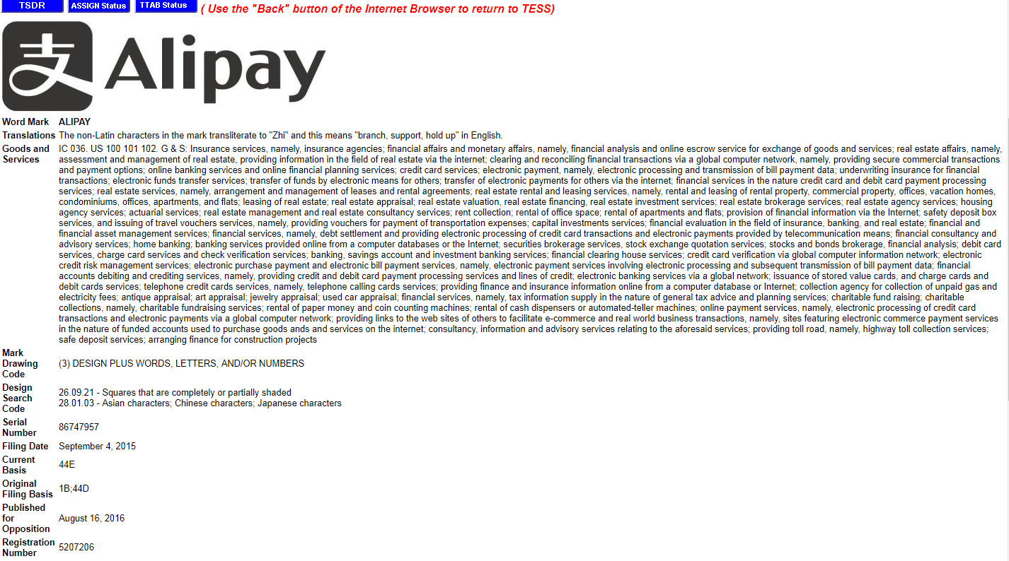 4.例如查詢:支付寶ALIPAY,在美國的注冊情況;