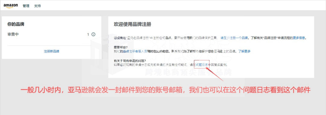 12.亞馬遜會發(fā)一封郵件到你的郵箱,留意郵箱,郵件也可以在品牌備案界面的問題日志里看到