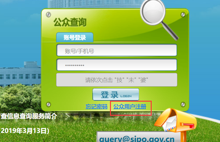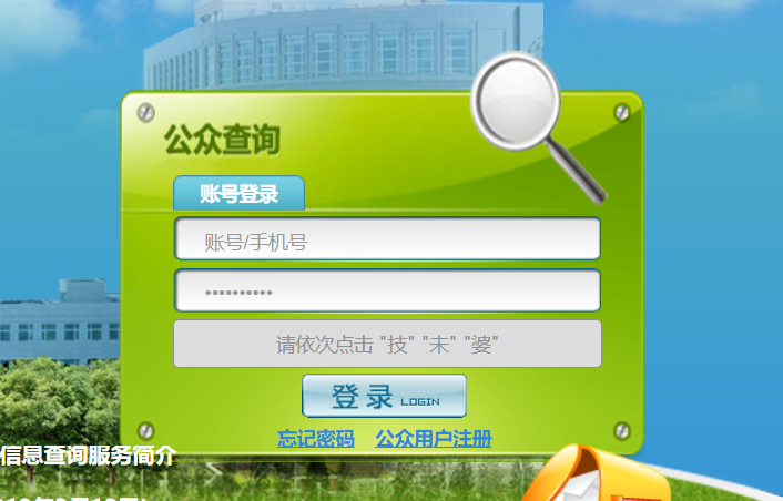 11、注冊(cè)成功后,在公眾查詢登錄剛才注冊(cè)號(hào)的賬號(hào),一次輸入賬號(hào)、密碼和點(diǎn)擊圖形驗(yàn)證后點(diǎn)擊登錄: