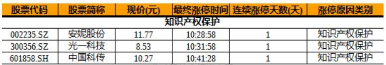 而今日,知識產(chǎn)權概念股也表現(xiàn)搶眼。盤面上,安妮股份(002235)直線封板,光一科技(300356)、中國科傳(601858)隨后漲停。