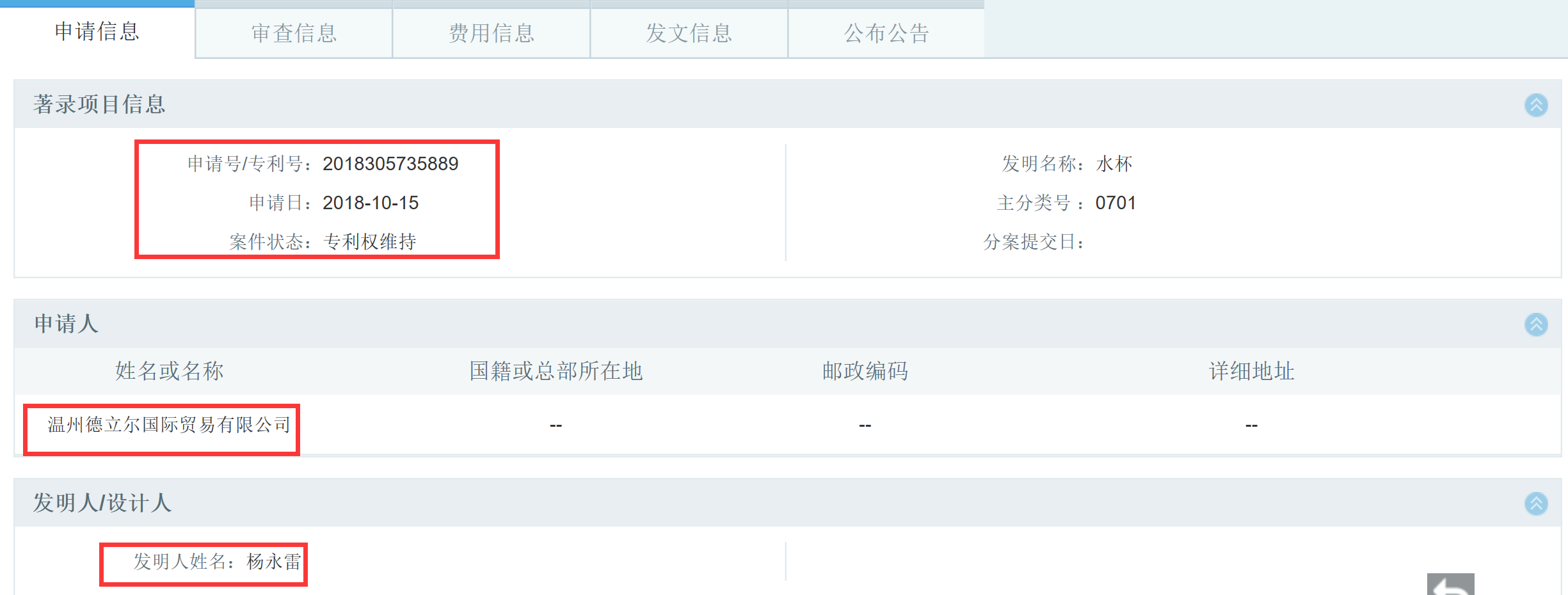 5、如點(diǎn)擊查詢(xún)申請(qǐng)信息,彈出的頁(yè)面中可查看到著錄項(xiàng)目信息、申請(qǐng)人、發(fā)明人等信息。