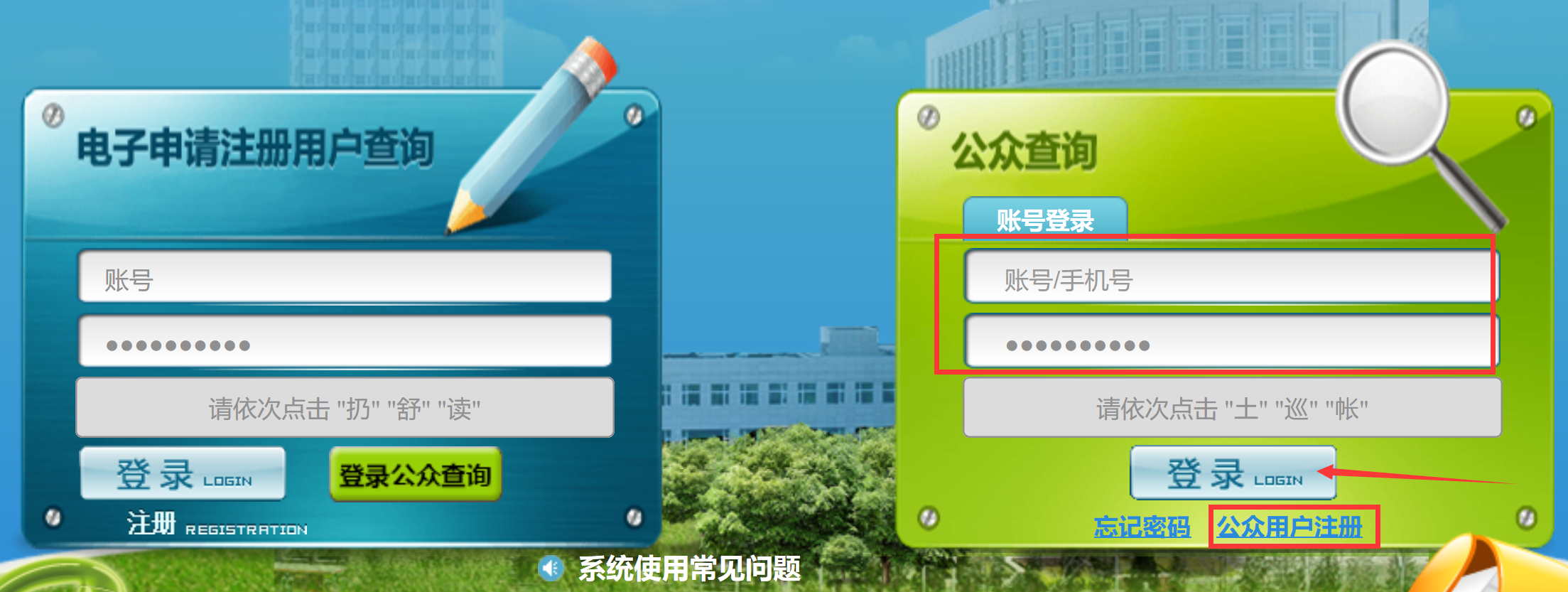2、進(jìn)入后,通過(guò)右邊的公眾查詢(xún)框進(jìn)行查詢(xún)。首先輸入賬號(hào)和密碼進(jìn)行登錄,若是首次查詢(xún),可通過(guò)“公眾用戶(hù)注冊(cè)”按提示注冊(cè)一個(gè)賬戶(hù)后,再進(jìn)行登錄。