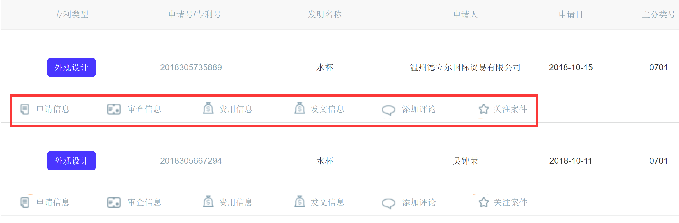 4、在查詢(xún)結(jié)果中找到你想查詢(xún)的那個(gè)外觀設(shè)計(jì)專(zhuān)利,點(diǎn)擊該外觀設(shè)計(jì)專(zhuān)利下方的各個(gè)選項(xiàng),便可以查詢(xún)?cè)撏庥^設(shè)計(jì)專(zhuān)利的各種信息。