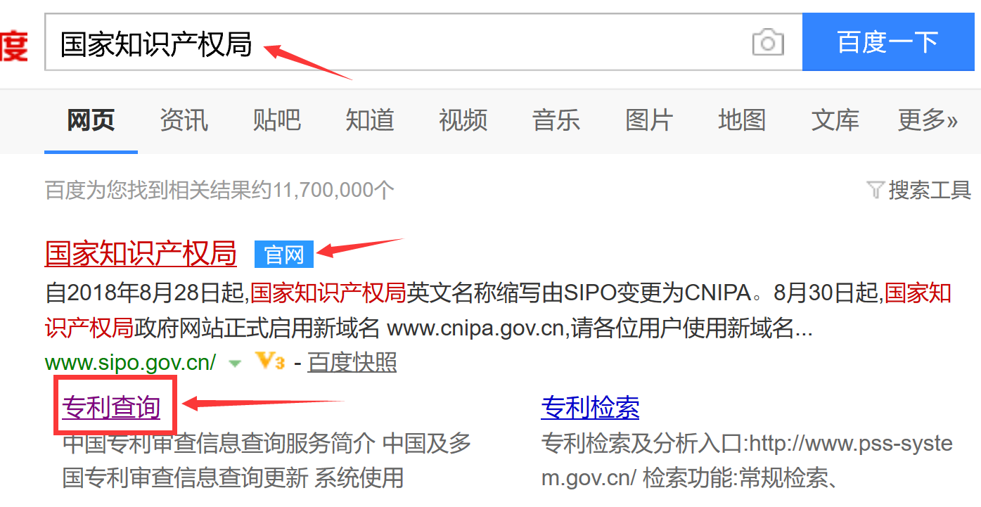 1、打開(kāi)電腦,打開(kāi)瀏覽器,在瀏覽器中搜索“國(guó)家知識(shí)產(chǎn)權(quán)局”,在搜索結(jié)果中找到“國(guó)家知識(shí)產(chǎn)權(quán)局官網(wǎng)”,在官網(wǎng)的下方功能欄選擇“專(zhuān)利查詢(xún)”,點(diǎn)擊進(jìn)入。