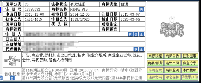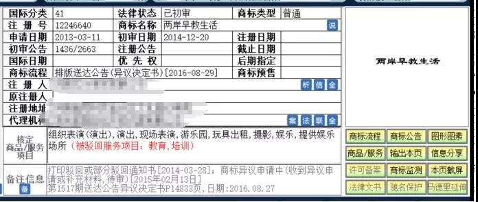 2、兩岸早教生活商標(biāo),13年申請(qǐng),14年初審,最后因他人版權(quán)在先為由,在公告期內(nèi)被異議,最終無(wú)效。