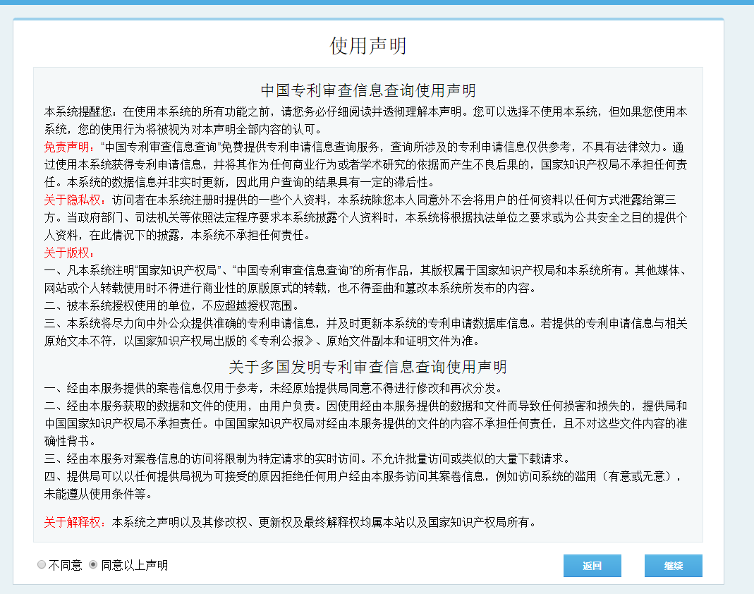 第三步,選擇“同意以上聲明”,再點擊“繼續(xù)”,進入查詢頁面。