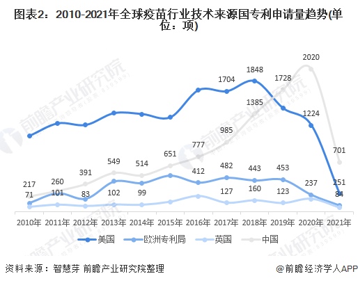 從趨勢(shì)上看,2010-2018年,美國(guó)疫苗專利申請(qǐng)數(shù)量遙遙領(lǐng)先,但是在2019年后被中國(guó)反超。2020年,中國(guó)疫苗專利申請(qǐng)量為2020項(xiàng),美國(guó)疫苗專利申請(qǐng)量下降至1224項(xiàng)。