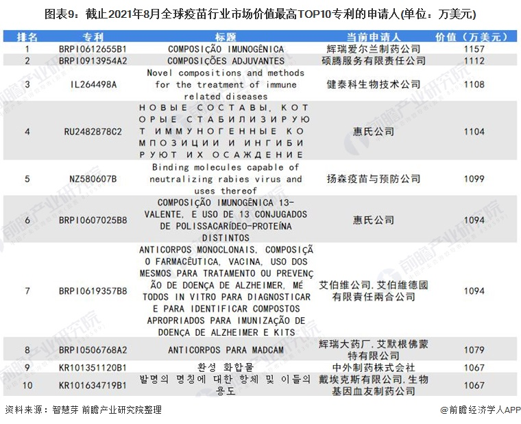 全球疫苗市場(chǎng)價(jià)值最高TOP10專利中,有2席由惠氏公司占據(jù),而輝瑞愛爾蘭制藥公司擁有全球疫苗市場(chǎng)價(jià)值最高的專利,為1157萬美元。