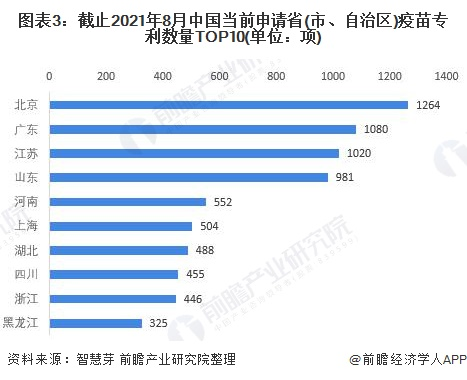 中國(guó)方面,北京為中國(guó)當(dāng)前申請(qǐng)疫苗專利數(shù)量最多的省份,累計(jì)當(dāng)前疫苗專利申請(qǐng)數(shù)量高達(dá)1264項(xiàng)。廣東和江蘇當(dāng)前申請(qǐng)疫苗專利數(shù)量均超過1000項(xiàng)。中國(guó)當(dāng)前申請(qǐng)省(市、自治區(qū))疫苗專利數(shù)量排名前十的省份還有山東、河南、上海、湖北、四川、浙江和黑龍江。