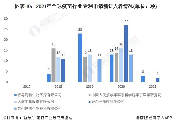 全球新進(jìn)入者有5位,分別是青島海特生物醫(yī)療{}、中國(guó)人民解放軍軍事科學(xué)院軍事醫(yī)學(xué)研究院、天康生物股份{}、愛爾蘭詹森科學(xué)公司和蘇州世諾生物技術(shù){}。并且這五大新進(jìn)入者在2020年申請(qǐng)疫苗專利較為活躍,其中愛爾蘭詹森科學(xué)公司申請(qǐng)的疫苗專利數(shù)量最多,為27項(xiàng)。