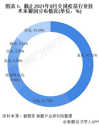 前,全球疫苗第一大技術(shù)來源國(guó)為美國(guó),美國(guó)疫苗專利申請(qǐng)量占全球疫苗專利總申請(qǐng)量的42.51%;其次是中國(guó),中國(guó)疫苗專利申請(qǐng)量占全球疫苗專利總申請(qǐng)量的21.79%。歐洲和英國(guó)雖然排名第三和第四,但是與排名第一的美國(guó)專利申請(qǐng)量差距較大。
