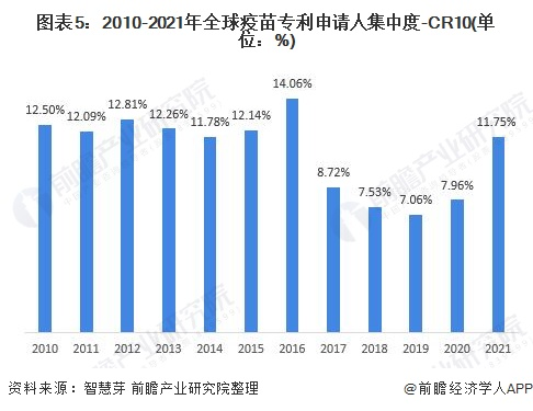 2010-2021年8月,全球疫苗專利申請(qǐng)人CR10呈現(xiàn)波動(dòng)下降趨勢(shì),由2010年的12.50%波動(dòng)下降至2021年8月的11.75%。整體來看,全球疫苗專利申請(qǐng)人集中度不高,且集中度呈現(xiàn)下降趨勢(shì)。