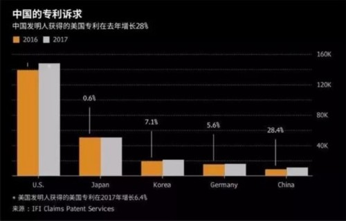 美國商業(yè)專利數(shù)據(jù)庫(IFIClaims)發(fā)布的最新報告顯示,不到10年時間里,中國企業(yè)在美國獲得專利數(shù)量已增至此前近10倍;特別是2017年較2016年增長28%,中國首次成為前五大美國專利獲得國。